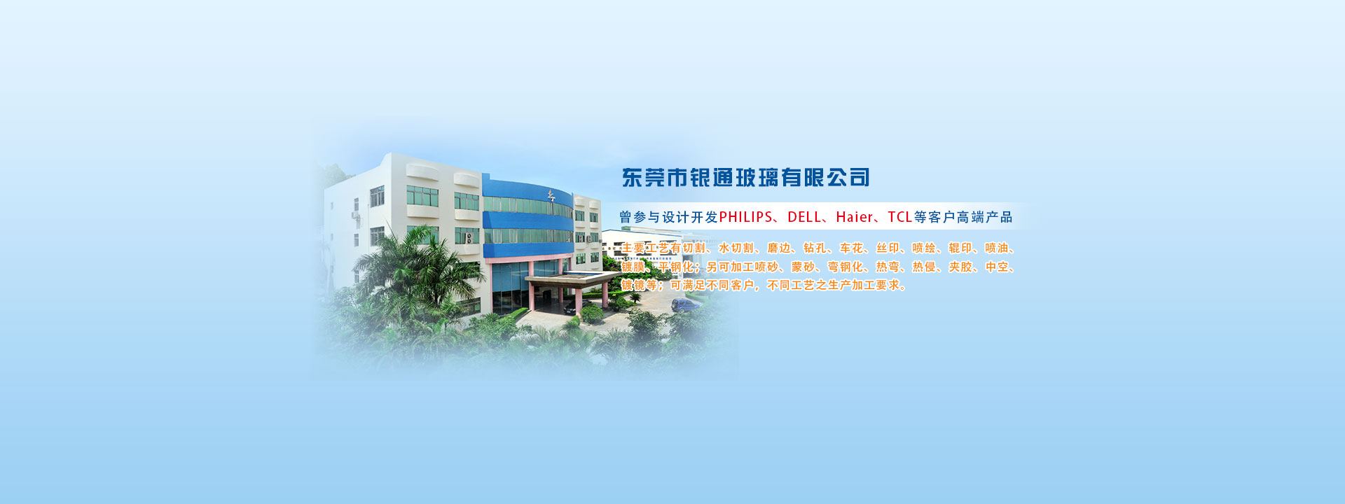 東莞市銀通玻璃有限公司創(chuàng)建于1995年,多年以來(lái),銀通公司一直在玻璃深加工行業(yè)潛心研究,用心經(jīng)營(yíng),發(fā)揮特長(zhǎng),開拓占領(lǐng)國(guó)際國(guó)內(nèi)市場(chǎng),不斷贏得客戶信賴!迄今為止,銀通公司已擁有占地15000㎡的工業(yè)廠房,設(shè)有2000㎡原片倉(cāng)庫(kù),可儲(chǔ)存5000噸用于生產(chǎn)使用的原片,并設(shè)有500平方米的樣板展示廳,主要產(chǎn)品為家用電器玻璃、家具玻璃、移門系列玻璃,各色各樣的樣品為客人設(shè)計(jì)提供了靈感。在沙田鎮(zhèn)穗豐年工業(yè)區(qū),設(shè)有一個(gè)可容1.5萬(wàn)噸原板玻璃的1萬(wàn)㎡的專用倉(cāng)庫(kù),為銀通公司玻璃貿(mào)易、深加工及安裝工程,奠定了穩(wěn)固的基礎(chǔ),提供了有力的保障。